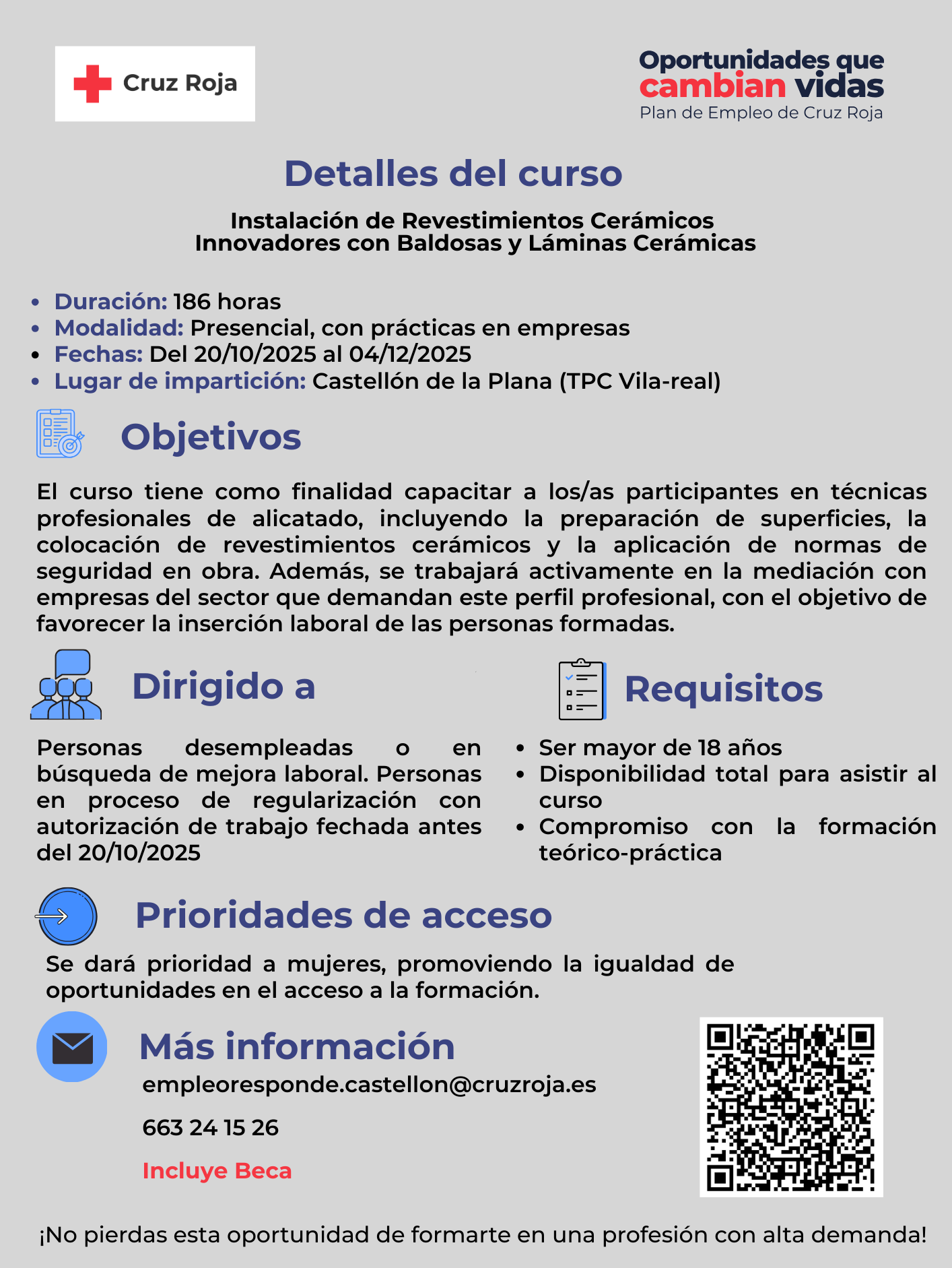 Cruz Roja Española en Castellón, en el marco del Plan de Empleo, organiza una iniciativa para la capacitación en Instalación de Revestimientos Cerámicos, cuyo inicio está previsto para el próximo 20 de octubre.